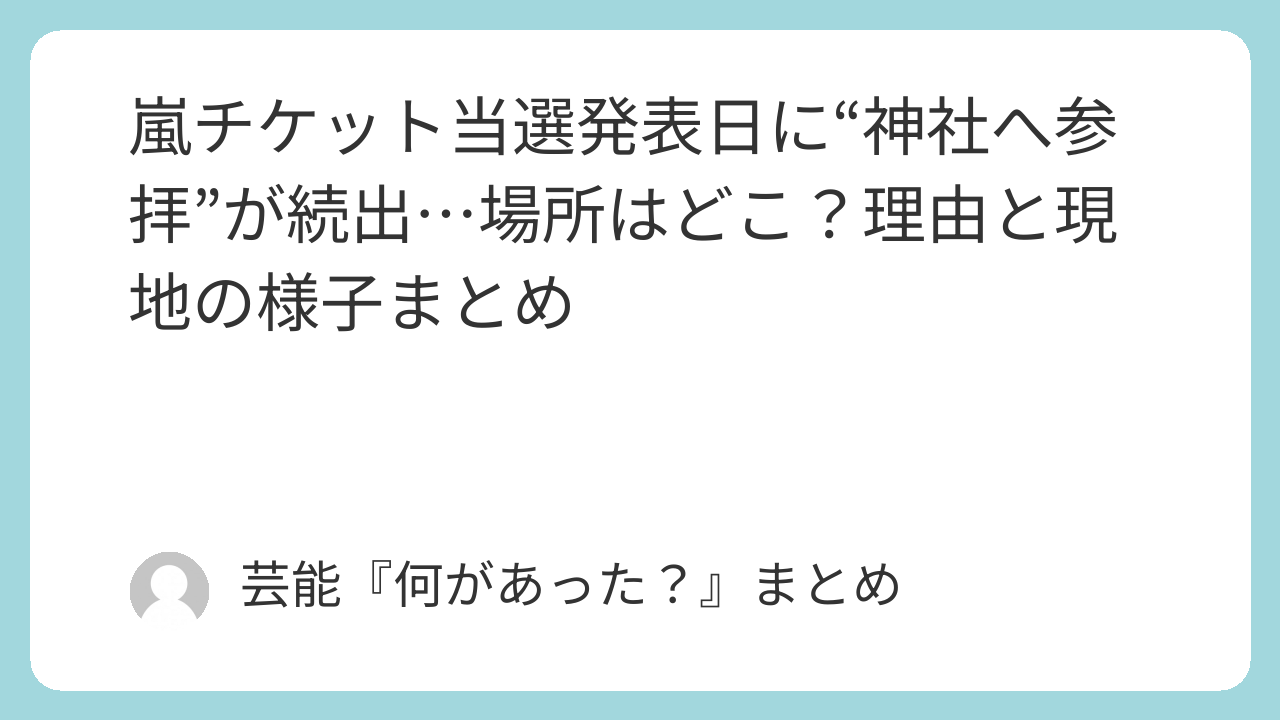 嵐のチケット当落発表日にあわせて、「神社にお参りしてきた」「絵馬を書いてきた」という投稿がSNSで一気に増え話題になりました。中でも“推し活神社”として知られる名古屋の神社に参拝者が集まり、当選祈願やお礼参りの姿が取材されています。この記事では、混雑をあおらない配慮をしつつ、報道で触れられた「場所はどこ?」「なぜ参拝するの?」「現地はどんな様子?」を公式・報道ベースで整理します。
