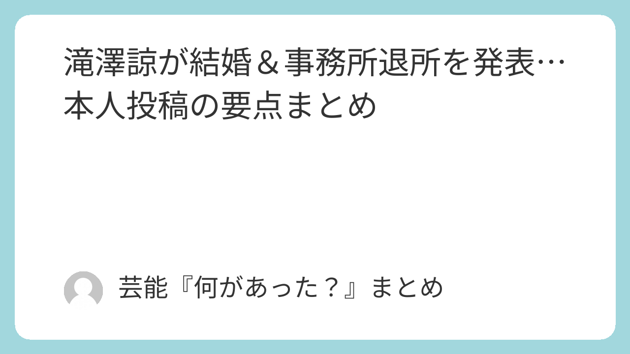 滝澤諒さんは、自身のXで結婚と事務所退所を報告しました。お相手は一般女性とされ、詳細は未公表。退所後の体制や今後の活動については、公式の追加発表が出やすいポイントなので、まずは本人の発信を軸に見守りたいところです。祝福の声が広がる一方で、活動の新情報を待つ空気も強まっています。
