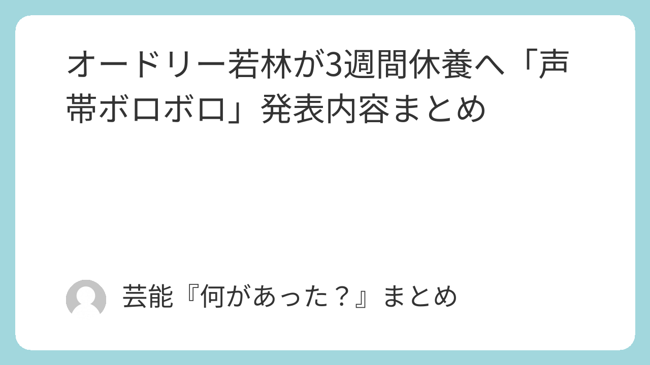 オードリーの若林正恭さんは、声帯の不調により3週間の休養を取ると発表しました。番組内では、医師から声帯の状態について説明を受けたことや、回復のために声を出さない期間が必要だという趣旨を語っています。まずは治療と休養を優先し、復帰は回復状況と番組の案内に沿って伝えられていく形になりそうです。