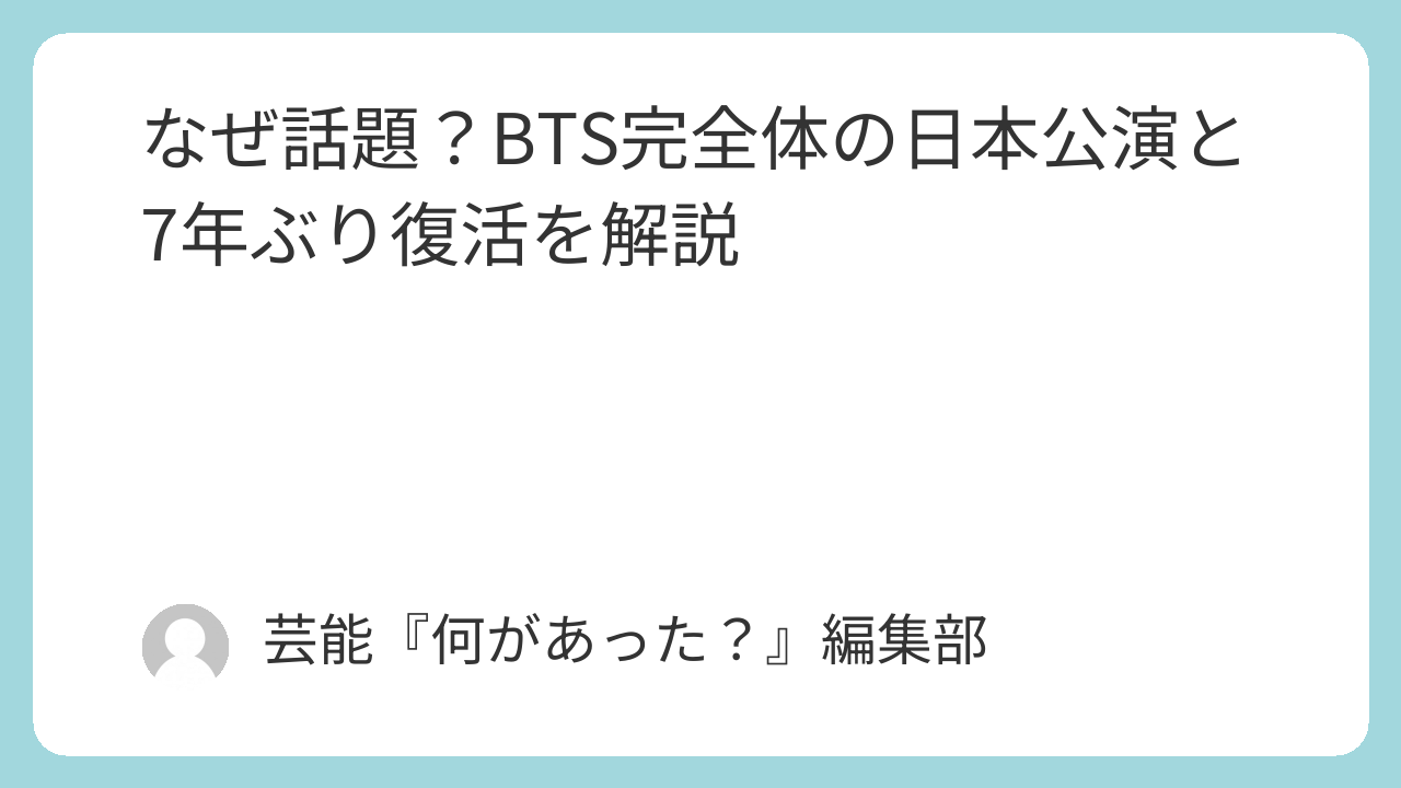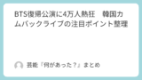 単に人気グループがライブをしたというだけではなく、長い空白を経て日本で再会できたというストーリー性が強かったことが、今回の熱量につながったと見られます。BTSにとってもARMYにとっても、今回の東京ドーム公演は“再スタートを実感する瞬間”として印象に残りやすい公演だったといえそうです。