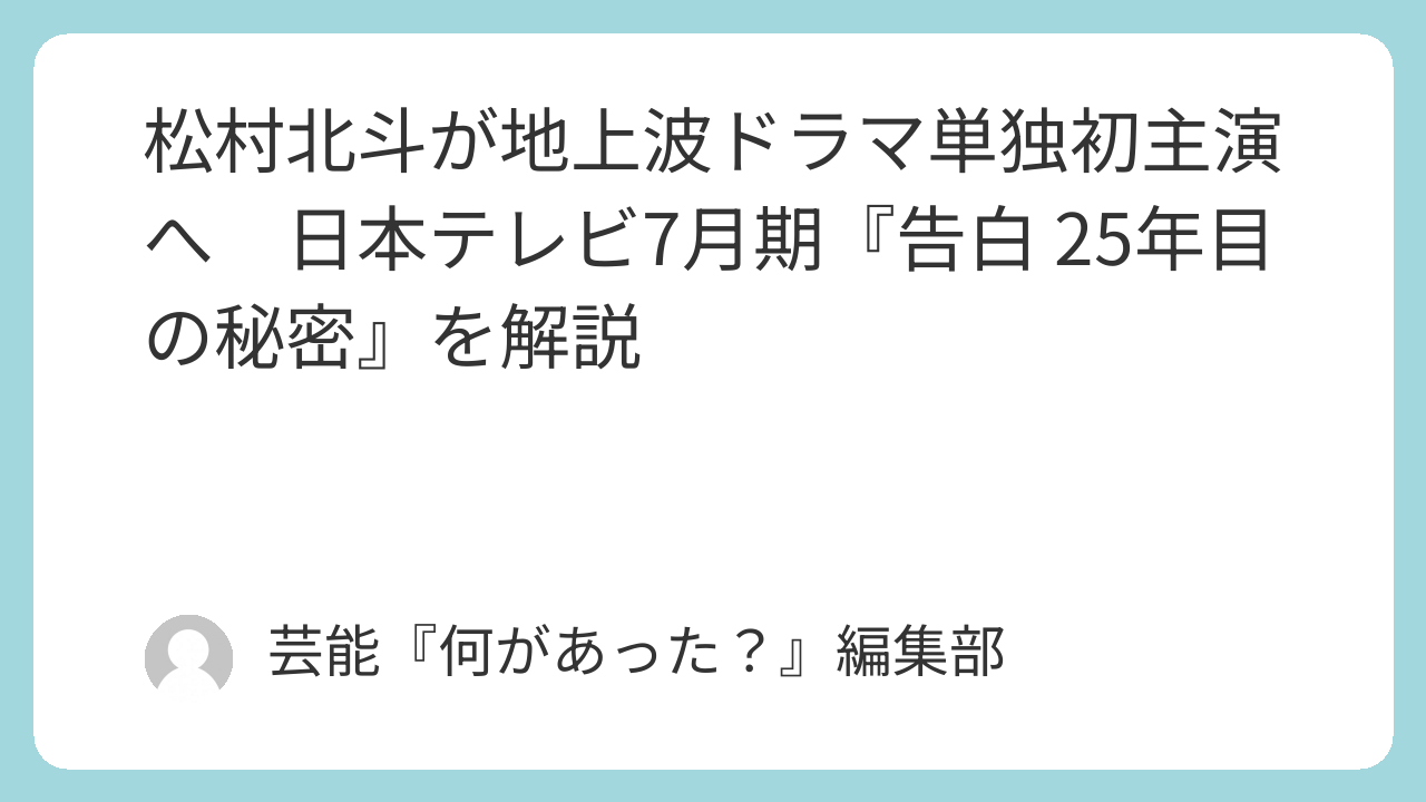 松村北斗さんに何があったのかというと、日本テレビ系7月期土曜ドラマ『告白-25年目の秘密-』で、地上波ドラマ単独初主演を務めることが発表されました。作品は25年にわたる片思いと秘密を描く完全オリジナルのラブサスペンスで、松村さんは主人公・雪村爽太を演じます。今回ここまで話題になっているのは、単独初主演という節目に加えて、土曜夜9時台の注目枠で、かなり難しそうな役を任されたからです。今後は共演者や初回放送日の発表が、さらに注目を集めそうです。