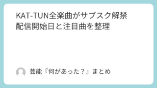 KAT-TUN KAT-TUN全楽曲がサブスク解禁 配信開始日と注目曲を整理 KAT-TUNの全楽曲がサブスク解禁。配信開始日、20周年記念日との関係、対象範囲、全312曲の内容、今あらためて聴きたい注目曲を分かりやすく整理しています。 2026.03.22 KAT-TUNサブスク解禁音楽ニュース