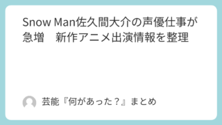 1.芸能ニュース Snow Man佐久間大介の声優仕事が急増 新作アニメ出演情報を整理 Snow Man佐久間大介の声優仕事が急増中?新作アニメ「尚善」出演情報をもとに、役名、放送時期、フジテレビ「B8station」での放送、注目ポイントを整理します。 2026.03.18 1.芸能ニュースSnow Manアニメ