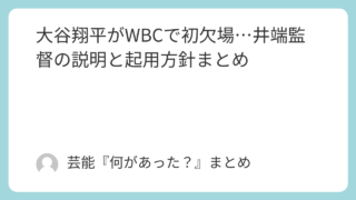 WBC 大谷翔平がWBCで初欠場…井端監督の説明と起用方針まとめ 大谷翔平がWBCで今大会初欠場。井端監督が説明した理由(投球練習・疲労考慮)と、今後の起用方針の見方を整理します。 2026.03.11 WBCスポーツニュース侍ジャパン