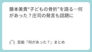 1.芸能ニュース 藤本美貴“子どもの骨折”を語る…何があった?庄司の発言も話題に 藤本美貴が語った「子どもの骨折」エピソードが話題。庄司智春の発言内容、何があったのかの要点、SNSの反応をまとめて整理します。 2026.01.22 1.芸能ニュース育児・子育て