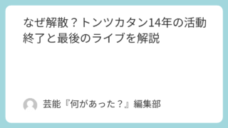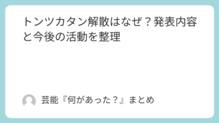 1.芸能ニュース なぜ解散?トンツカタン14年の活動終了と最後のライブを解説 トンツカタンはなぜ解散したのか。14年目での活動終了の流れ、公式発表で伝えられた理由、最後のライブ「ありがトンツカタン」の内容、ファンの反応まで分かりやすくまとめています。 2026.04.18 1.芸能ニュース8.SNS・トレンド話題