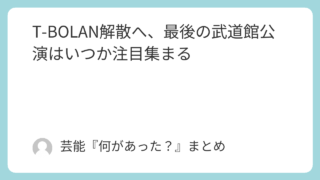 T-BOLAN T-BOLAN解散へ、最後の武道館公演はいつか注目集まる T-BOLAN解散発表を整理。活動終了日は2026年8月10日、日本武道館での最終公演「T-BOLAN LAST LIVE 2026 -FINAL in 日本武道館-」の日時や、ラストツアーとの関係を分かりやすくまとめています。 2026.03.26 T-BOLANロックバンド音楽ニュース