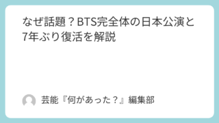 5.音楽・ライブ なぜ話題?BTS完全体の日本公演と7年ぶり復活を解説 BTSの完全体による日本公演はなぜ話題なのか。東京ドームで行われた約7年ぶりのステージの意味、公演内容、ARMYの反応、注目された理由を分かりやすく解説します。 2026.04.19 5.音楽・ライブ8.SNS・トレンド話題
