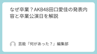 1.芸能ニュース なぜ卒業?AKB48田口愛佳の発表内容と卒業公演日を解説 AKB48田口愛佳さんはなぜ卒業するのか。4月18日の卒業発表内容、6月22日の卒業公演日、公式ブログで伝えられた本人コメント、今後の注目点まで分かりやすく解説します。 2026.04.18 1.芸能ニュース2.人物プロフィール8.SNS・トレンド話題