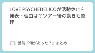ライブ・フェス LOVE PSYCHEDELICOが活動休止を発表…理由は?ツアー後の動きも整理 LOVE PSYCHEDELICOが25周年ツアー後の活動休止を発表。理由は公表された?ツアー日程の要点、休止後の動き、代表曲を公式情報ベースで整理。 2026.01.21 ライブ・フェス邦楽音楽ニュース